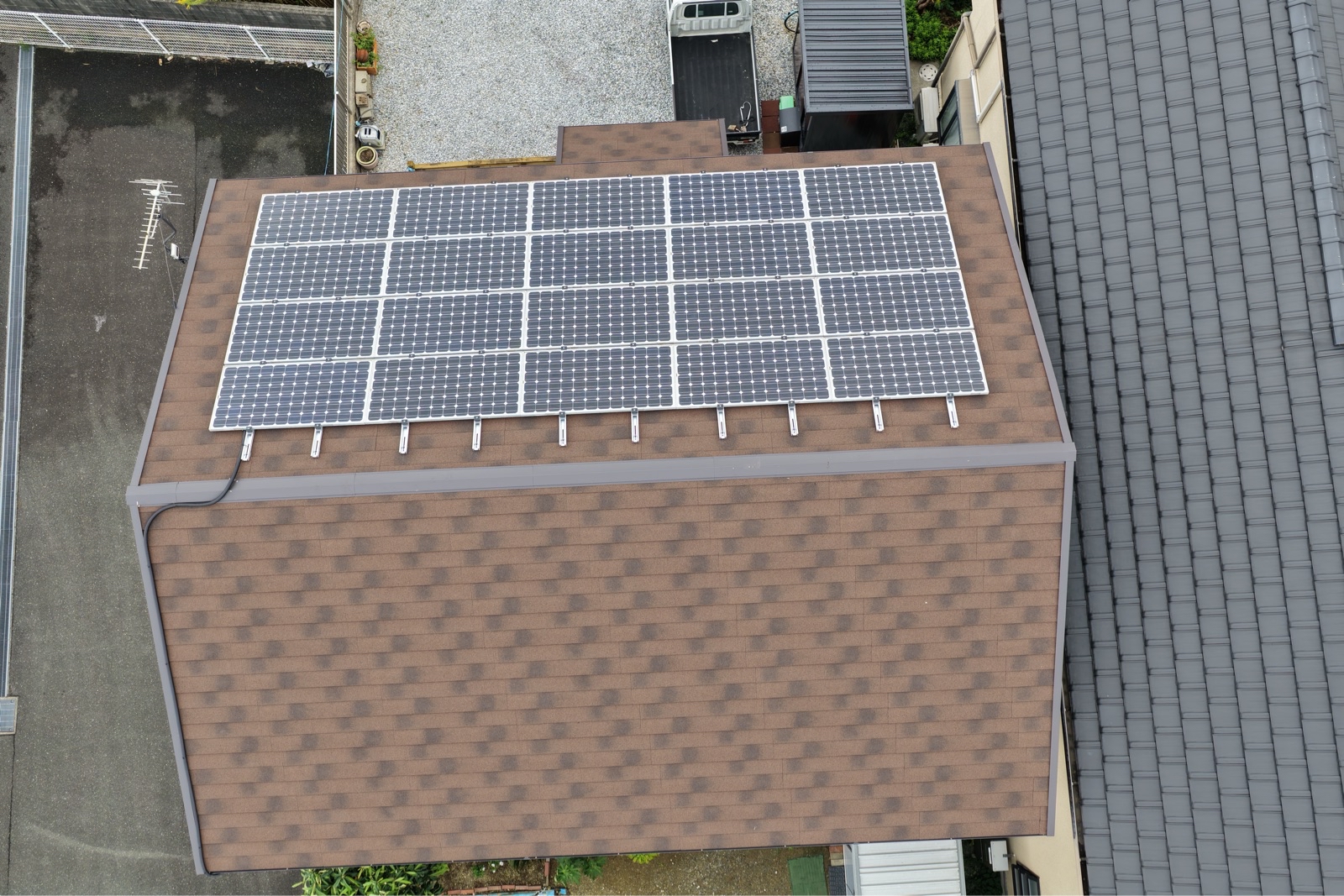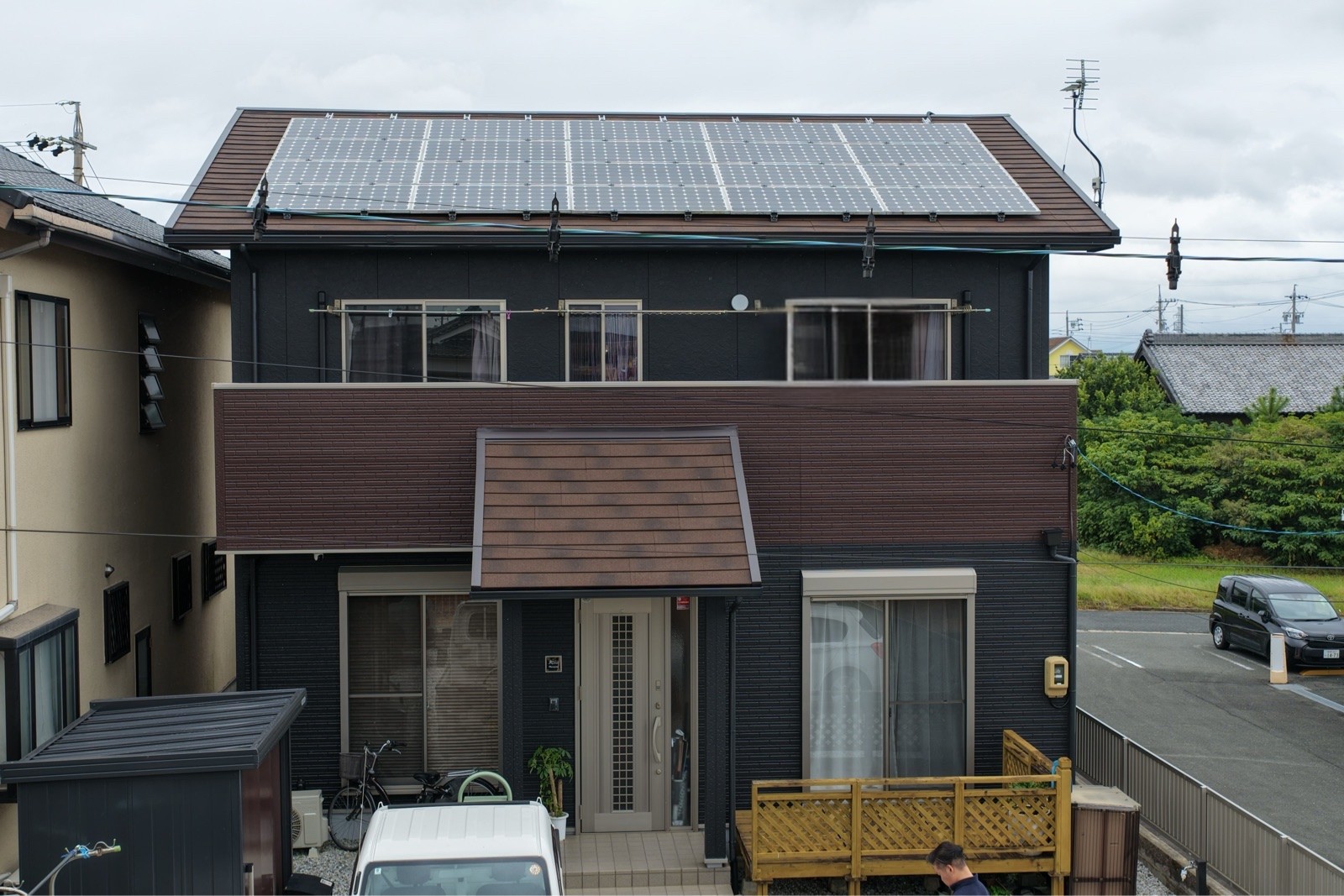 屋根には耐久性に優れた「ディプロマット」を採用。外壁だけでなく物置もお家全体の色味に合わせ、統一感のある仕上がりにこだわりました。最後はご家族皆様でご確認いただき、温かいお言葉をいただけたことが何よりの喜びです。
